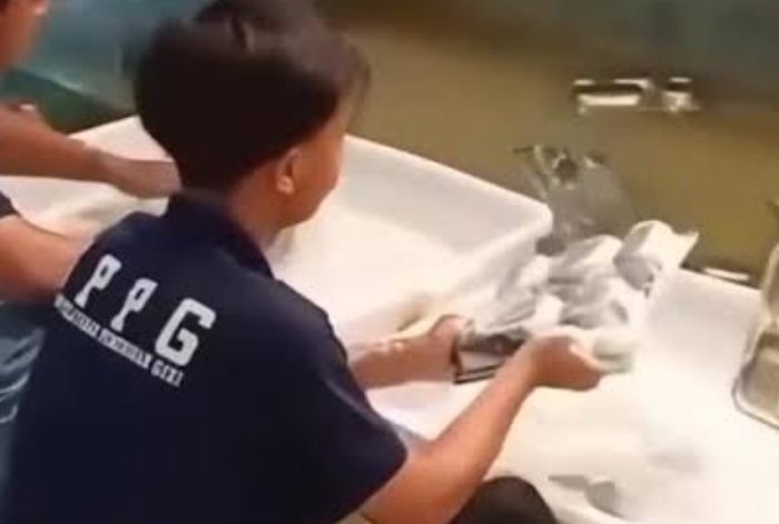 Rekaman video tersebut beredar luas sejak Jumat (3/10/2025), setelah dibagikan akun Instagram @fakta.indo. Dalam tayangan itu terlihat tiga orang petugas mencuci nampan ompreng MBG di sebuah wadah plastik berisi air berbusa. Namun, setelahnya wadah tersebut dibilas dengan cara dilempar ke bak air berwarna kecoklatan tanpa aliran air bersih.