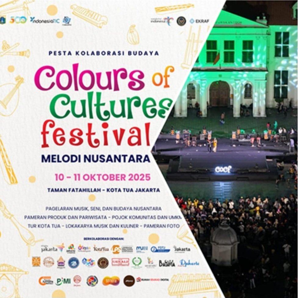 Jakarta, EKOIN.CO – Warna-warni budaya Nusantara akan kembali menyala di jantung sejarah Ibu Kota. Indonesia Tourism Information Center (ITIC) bersama Forum Komunikasi Penghubung Pemerintah Provinsi Seluruh Indonesia (FORKAPPSI), dengan dukungan Kementerian Pariwisata dan Ekonomi Kreatif, Pemerintah Provinsi DKI Jakarta, serta sejumlah lembaga strategis, siap menggelar Colours of Cultures Festival (CoCF) 2025 pada 10–11 Oktober 2025 di Taman Fatahillah, Kota Tua Jakarta.