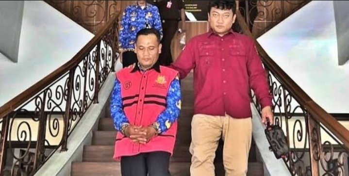 Dalam foto yang beredar, Ahmad Riyadi terlihat mengenakan rompi tahanan berwarna jambon di luar pakaian batik Korpri, sebelum digiring menuju ruang tahanan kejaksaan.