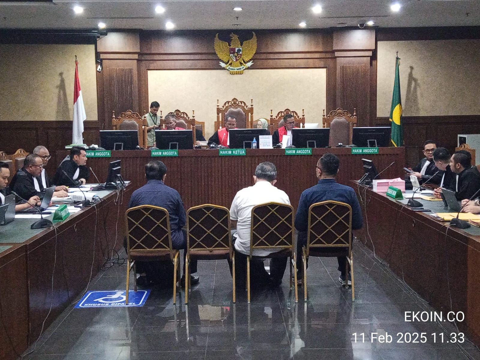 Jakarta, EKOIN.CO, 11 Februari 2025 – Pengadilan Tindak Pidana Korupsi (Tipikor) PN Jakarta Pusat menggelar sidang dengan terdakwa Heru Hanindyo, Erintuah Damanik, dan Mangapul. Sidang yang dipimpin oleh Ketua Hakim Teguh Santoso dengan anggota hakim Tony Irfan Mardiantos ini berlangsung di Ruang Sidang Prof. Dr. Kusumahatmaja. Jaksa Penuntut Umum (JPU) dalam persidangan ini adalah Bambang Diki Bagus K Nurachman.