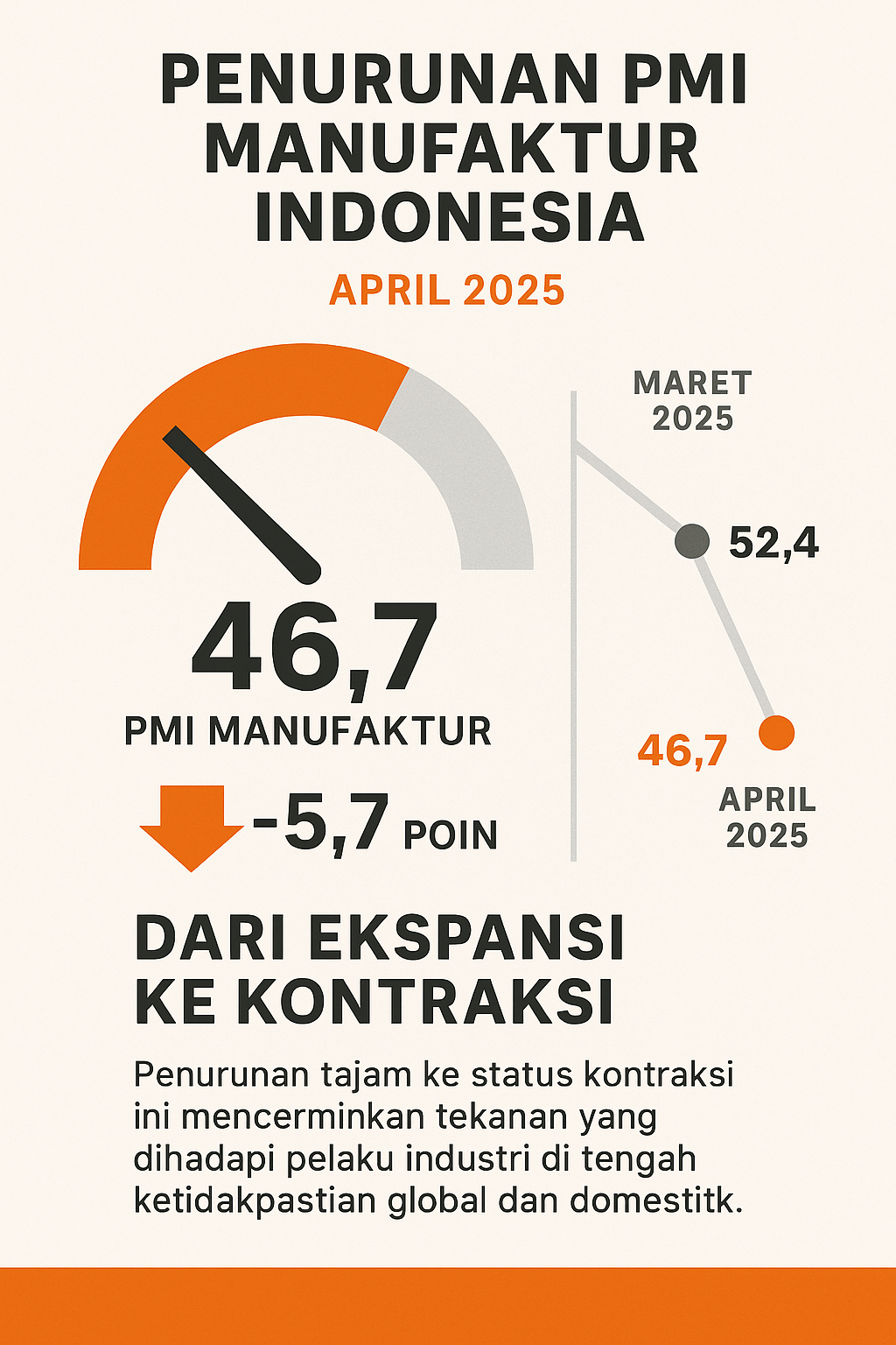 Jakarta, EKOIN.CO — Industri manufaktur Indonesia mengalami penurunan signifikan pada April 2025. Purchasing Manager’s Index (PMI) manufaktur yang dirilis S&P Global menunjukkan angka 46,7, merosot dari 52,4 pada Maret 2025. Perubahan ini menandai pergeseran kondisi dari ekspansi ke kontraksi.