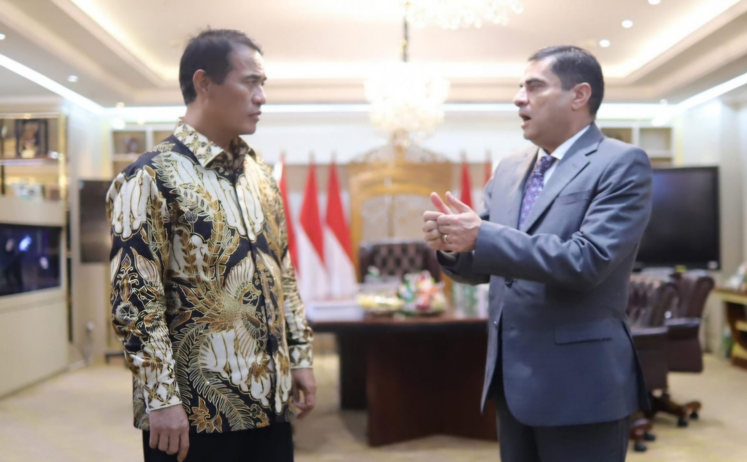 akarta, EKOIN.CO – Menteri Pertanian (Mentan) Andi Amran Sulaiman menerima kunjungan kehormatan dari Duta Besar Kerajaan Hasyimiah Yordania untuk Indonesia, Sudqi Atallah Al-Omoush, di kantor pusat Kementerian Pertanian, Jakarta, Rabu (14/5/2025). Pertemuan bilateral ini bertujuan untuk mempererat kerja sama strategis di sektor pertanian, terutama terkait pengadaan bahan baku pupuk, manajemen air, serta pengembangan klaster pertanian berbasis teknologi tinggi.