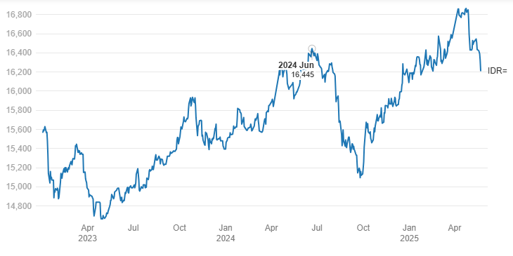Rupiah menguat ke level Rp16.215 per dolar AS pada 23 Mei 2025 di tengah meningkatnya kekhawatiran pasar terhadap kesehatan fiskal Amerika Serikat dan penurunan indeks dolar AS.