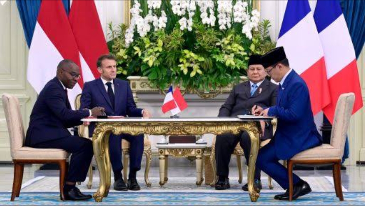 Presiden Republik Indonesia Prabowo Subianto dan Presiden Macron hadir langsung menyaksikan penandatanganan dokumen.