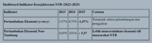 Sebagai contoh pada tahun 2022 dan 2023, pertumbuhan ekonomi NTB bisa mencapai di atas 6–7% karena lonjakan ekspor tembaga. Tapi saat itu masyarakat kecil tidak merasakan efeknya, bahkan inflasi naik karena bahan pokok mahal, sektor pertanian stagnan, dan pengangguran tinggi.
