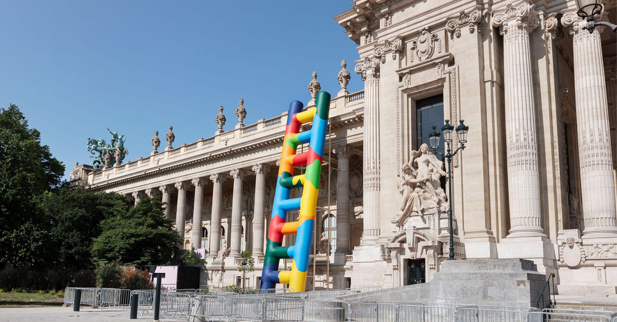 Ladder raksasa berwarna mencolok itu membentang lebih dari 20 meter dan tampak bersandar di sisi luar Grand Palais yang telah direnovasi. Instalasi tiup ini pertama kali ditampilkan pada tahun 2015 di Palazzo Strozzi, Florence, dan kini muncul kembali dalam skala dan konteks berbeda.