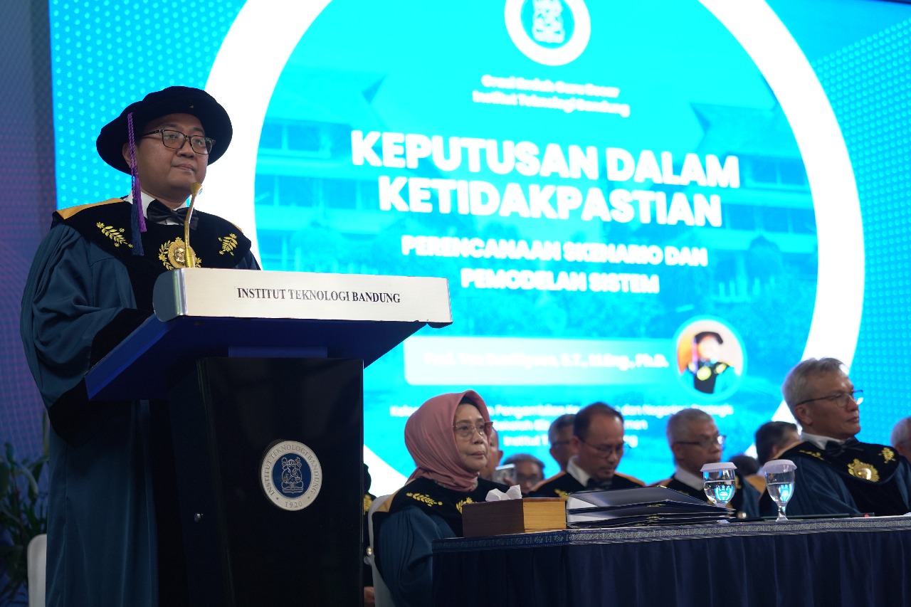 Dalam orasi bertajuk “Keputusan dalam Ketidakpastian: Perencanaan Skenario dan Pemodelan Sistem”, Prof. Yos membahas urgensi berpikir strategis ketika masa depan sulit diprediksi. Ia menekankan bahwa ketidakpastian adalah satu-satunya hal yang pasti dalam dinamika global saat ini.