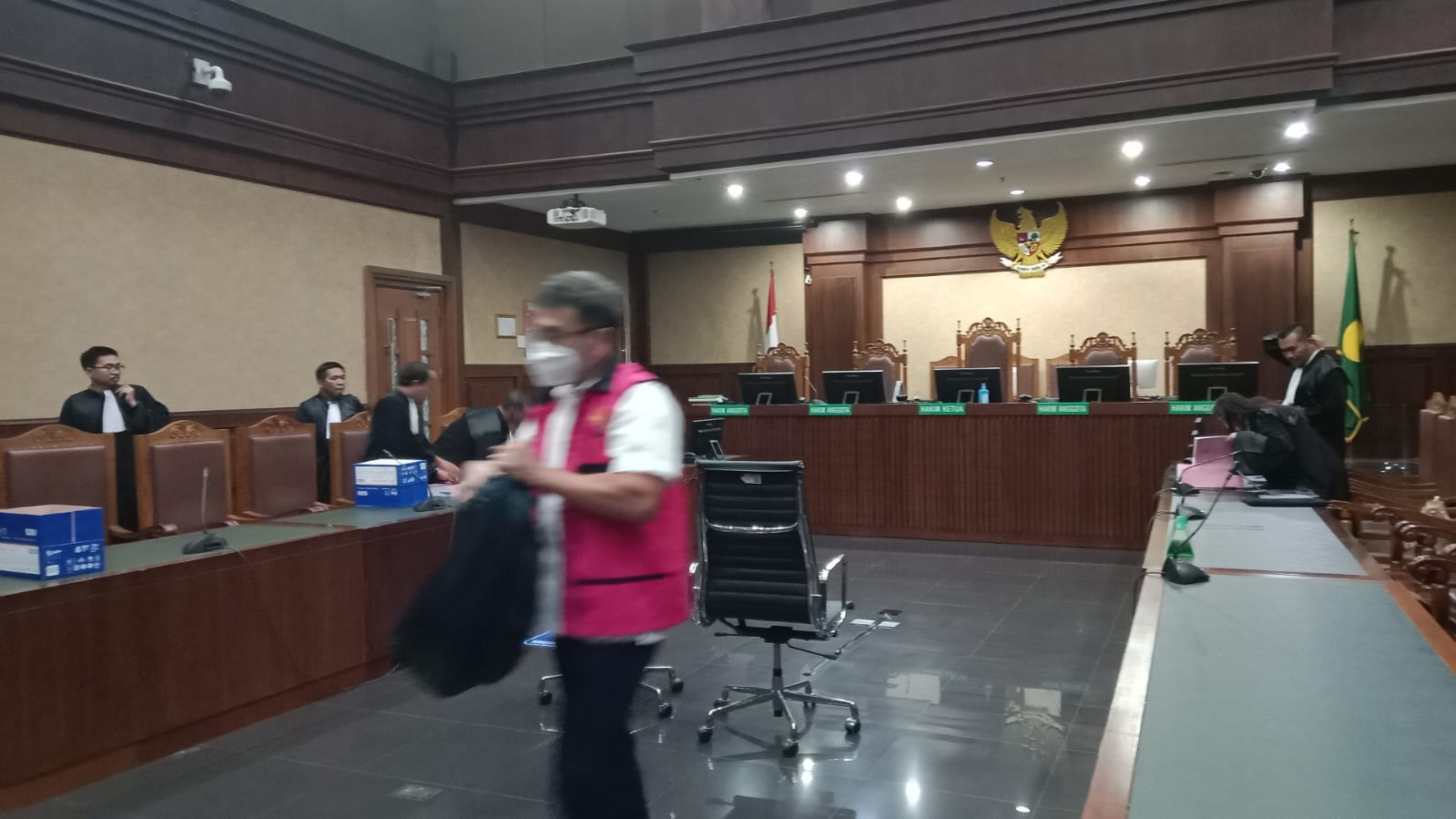 Charles hadir mengenakan batik cokelat dan duduk di kursi terdakwa sejak awal persidangan.