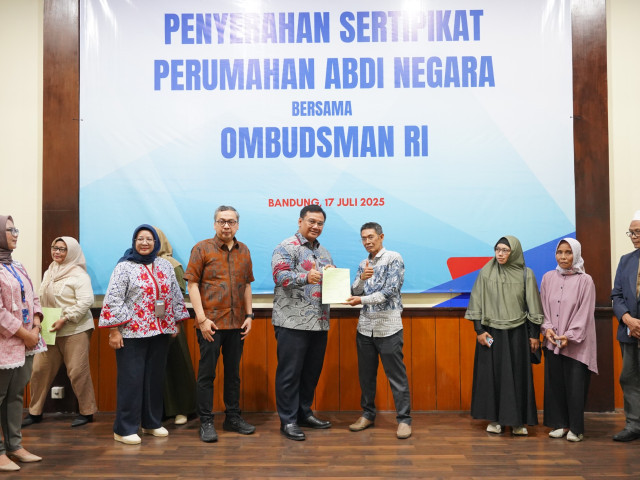 Jakarta, EKOIN.CO – Sebanyak 98 sertifikat hak milik diserahkan kepada penghuni Perumahan Abdi Negara 2 oleh Ombudsman Republik Indonesia bersama Bank Tabungan Negara (BTN) di Kantor BTN Cabang Bandung, Kamis (17/7/2025).