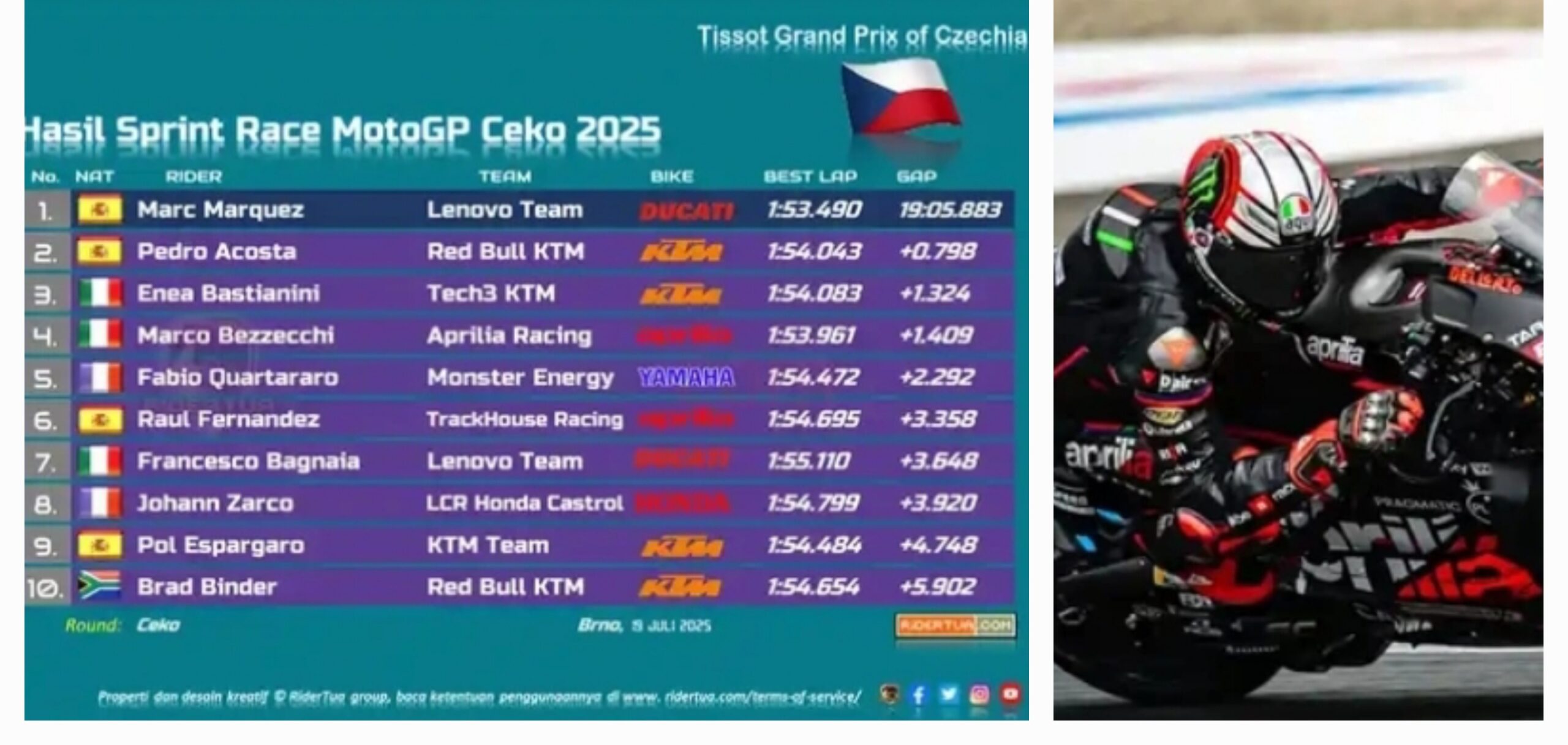 Sprint race Brno juga mencatat penampilan impresif dari Marc Marquez yang kembali tampil dominan sejak awal balapan. Hasil ini membuat persaingan klasemen makin ketat menjelang putaran berikutnya.