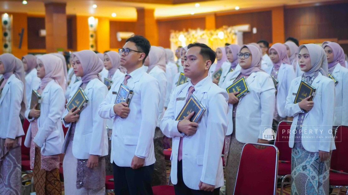 Prosesi pengambilan sumpah dilakukan bersama-sama dipandu oleh Dekan Zaki. Para dokter baru bersumpah melayani pasien tanpa diskriminasi dengan menjunjung tinggi nilai-nilai keislaman.
