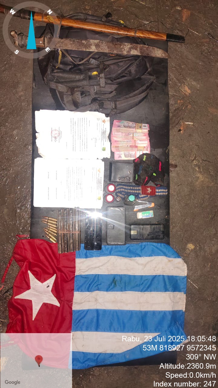 Barang bukti yang berhasil diamankan dari kedua lokasi operasi tersebut dari Kampung Kunga, Satgas menemukan uang tunai jutaan rupiah, beberapa senjata tajam (parang, panah), lima unit HP, satu unit HT, satu unit teropong, munisi kaliber 5,56 mm, serta dokumen dan barang pribadi yang mengindikasikan keterlibatan dalam jaringan separatis.