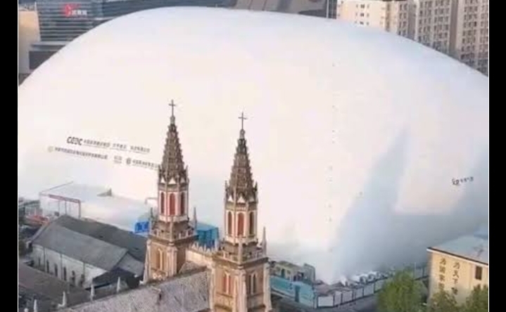 Jinan, EKOIN.CO – Pemerintah setempat telah memasang kubah inflasi raksasa di atas area konstruksi untuk meminimalkan polusi debu dan kebisingan yang biasa terjadi pada proyek perkotaan. Kubah unik ini berdiri setinggi 50 meter dan menutupi lahan seluas 20.000 meter persegi (Oddity Central, Jib).