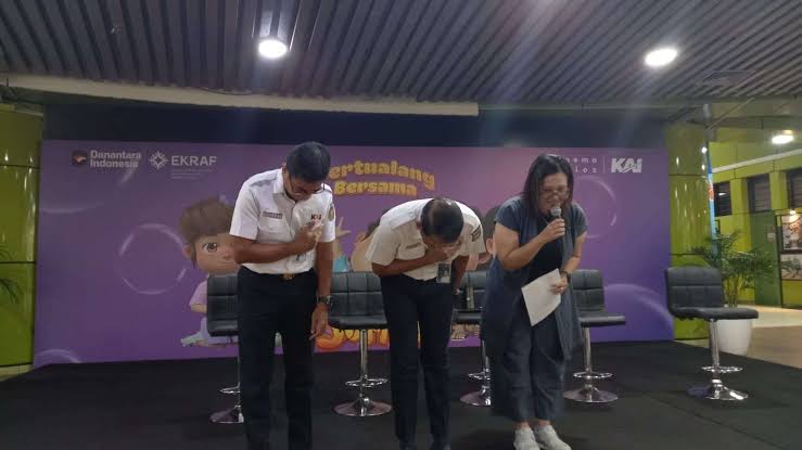 Direktur Utama KAI Didiek Hartantyo menundukkan kepala sebagai bentuk permintaan maaf kepada penumpang di Stasiun Gambir, Jakarta Pusat, Minggu (3/8/2025). Didiek menyampaikan permohonan maaf itu bersama EVP KAI Daop 1 Jakarta Yuskal Setiawan dan VP Public Relations KAI Anne Purba.