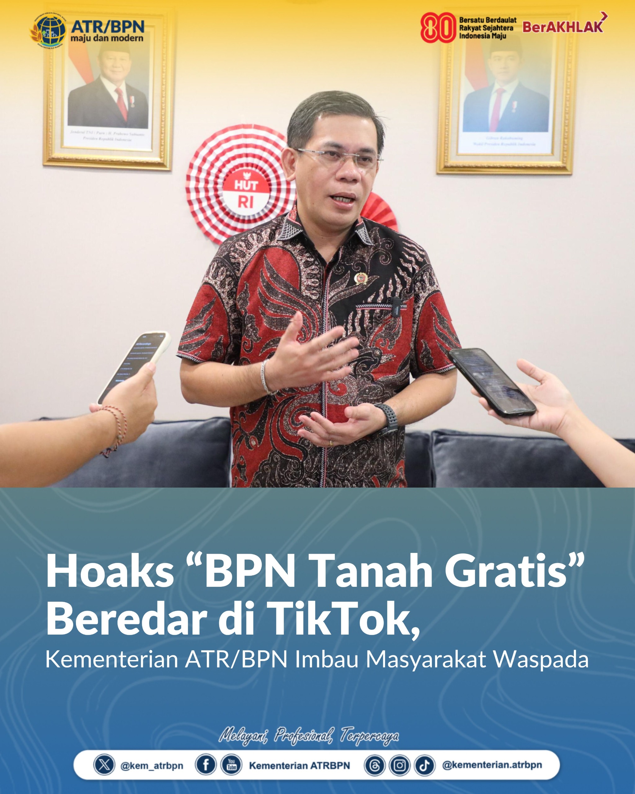Kepala Biro Hubungan Masyarakat (Humas) dan Protokol, Harison Mocodompis, menyampaikan agar masyarakat berhati-hati terhadap akun media sosial yang tidak jelas sumbernya. “Kami melihat banyak sekali akun TikTok @bpn_tanahgratis beredar. Untuk itu, masyarakat diimbau untuk tidak terpengaruh dengan akun media sosial tidak resmi yang menyebarkan klaim seperti ‘BPN Tanah Gratis’. Informasi dan layanan resmi hanya dapat diperoleh melalui kanal resmi Kementerian, yakni situs atrbpn.go.id dan akun media sosial resmi kami,” tegasnya saat ditemui di Kantor Kementerian ATR/BPN, Jakarta, Selasa (19/08/2025).