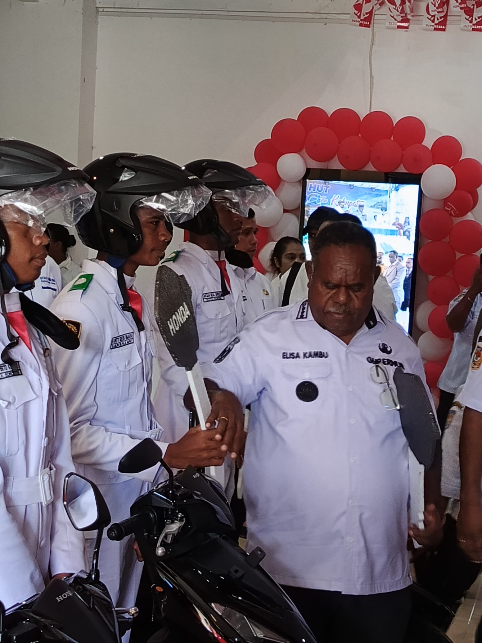 Papua Barat , – EKOIN – CO – Menteri Hukum (Menkum) Republik Indonesia, Supratman Andi Agtas, menepati janjinya untuk memberikan hadiah motor kepada tiga pasukan pengibar bendera pusaka (Paskibraka), yaitu Kristo Dimara, Afgan Sapulete, dan Frans Beto Kolowa. Pemberian motor dari Menkum diwakili oleh Gubernur Papua Barat Daya (PBD), Elisa Kambu, di Kantor Gubernur dan Sekretariat Daerah PBD, Sorong, Rabu (20/08/2025).