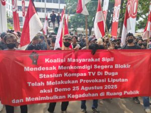 Jakarta , – EKOIN – CO – Sejumlah Massa yang menamakan Forum Masyarakat Sipil atau FORMASI menggelar aksi damai di depan Kantor Kementerian Komunikasi dan Digital atau KEMENKOMDIGI Jakarta pada 26/8/2025 menuntut agar Media KOMPAS TV segera di cabut izin siarnya atas dugaan ikut serta memprovokasi gerakan “MAKAR” yang terjadi pada Aksi Massa di depan Gedung DPR/MPR RI Tanggal 25/8/2025 kemarin.