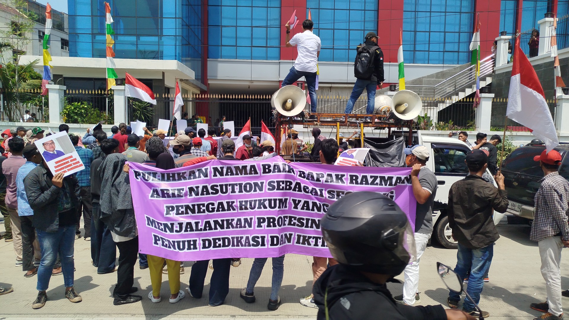 Aksi massa dari dua kelompok, yakni Aliansi Rakyat Bersuara Indonesia dan Aliansi Mahasiswa Peduli Hukum, berlangsung di depan Pengadilan Negeri Jakarta Utara pada Selasa (26/8/2025) sekitar pukul 12.13 WIB. Massa yang hadir menyampaikan orasi dengan tuntutan utama agar nama baik Razman Nasution dibersihkan dari berbagai tuduhan negatif yang selama ini diarahkan kepadanya.