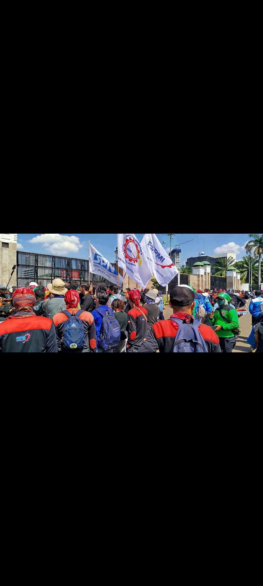 Sejumlah spanduk terlihat dibentangkan dengan berbagai tulisan aspirasi. Selain itu, perwakilan serikat buruh juga menyampaikan tuntutan agar pemerintah segera mengkaji ulang beberapa kebijakan yang masih menjadi perdebatan.