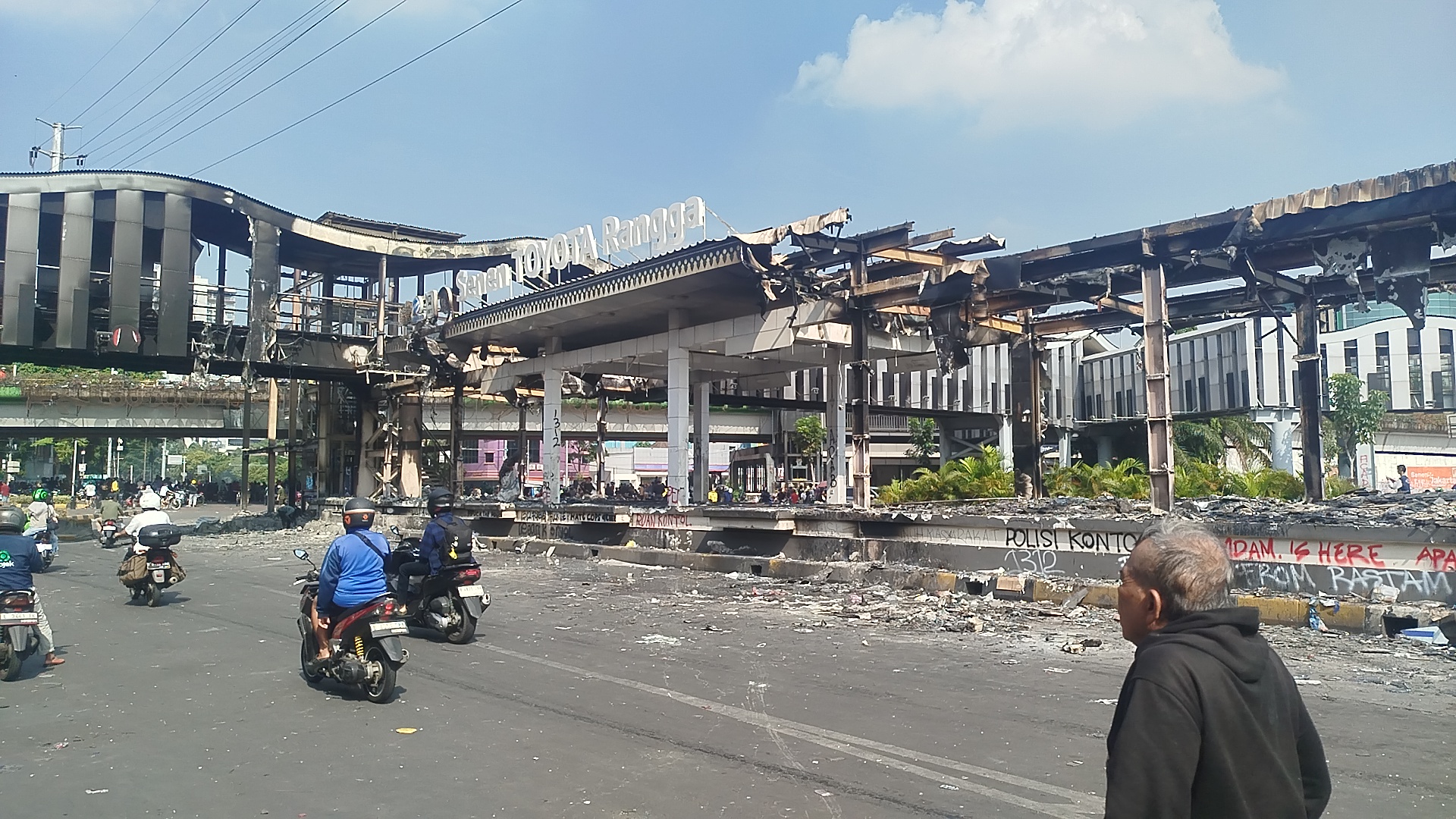 Halte Senen Toyota Rangga di Jakarta Pusat terbakar akibat aksi massa 29 Agustus 2025. PT TransJakarta mulai lakukan perbaikan, kerugian transportasi publik capai Rp 55 miliar