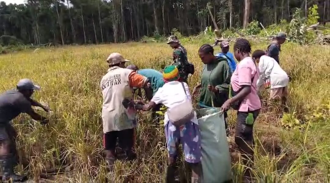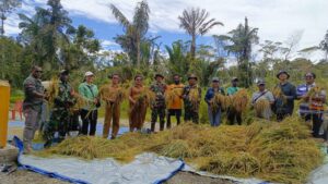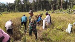 Timika , – EKOIN – CO – Dalam rangka mendukung ketahanan pangan sekaligus meningkatkan produktivitas pertanian, Pelda Safi’i bersama 4 Babinsa Koramil 1710-03/Kuala Kencana Kodim 1710/Mimika, bersama warga Kampung Iwaka dan Dinas Pertanian Kabupaten Mimika, melaksanakan panen padi gogo, Selasa (02/9/2025).