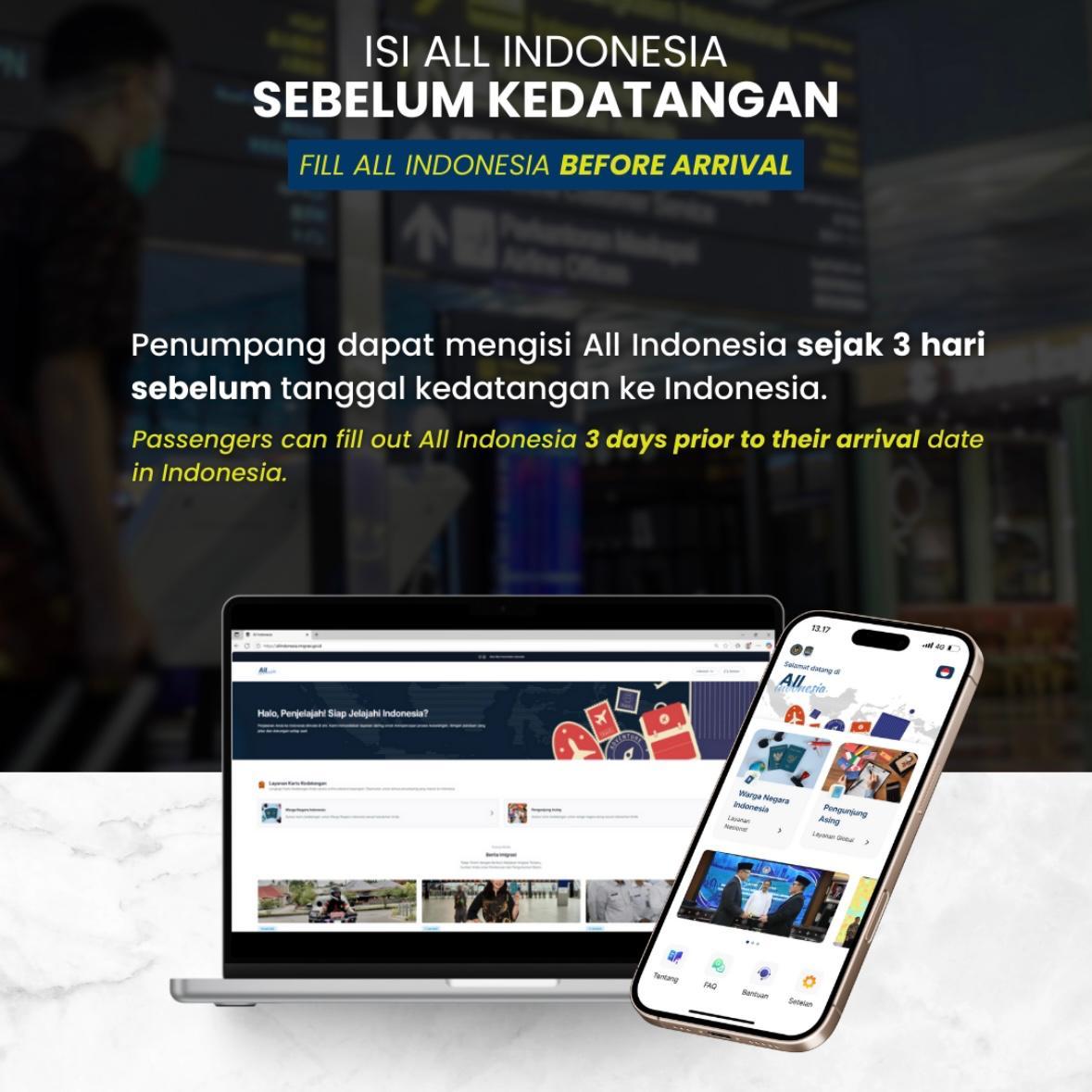 Untuk menjamin kenyamanan penumpang dan menghindari antrean panjang, Aplikasi All Indonesia dapat diisi sejak di negara asal, atau paling lambat tiga hari sebelum tanggal keberangkatan. Proses ini juga mencakup pembayaran visa saat kedatangan (visa on arrival). Karena itu, disarankan bagi para wisatawan untuk menyimpan kode QR yang dihasilkan setelah mengisi data. Kode QR tersebut harus ditunjukkan saat melewati loket imigrasi atau bea cukai di Indonesia.