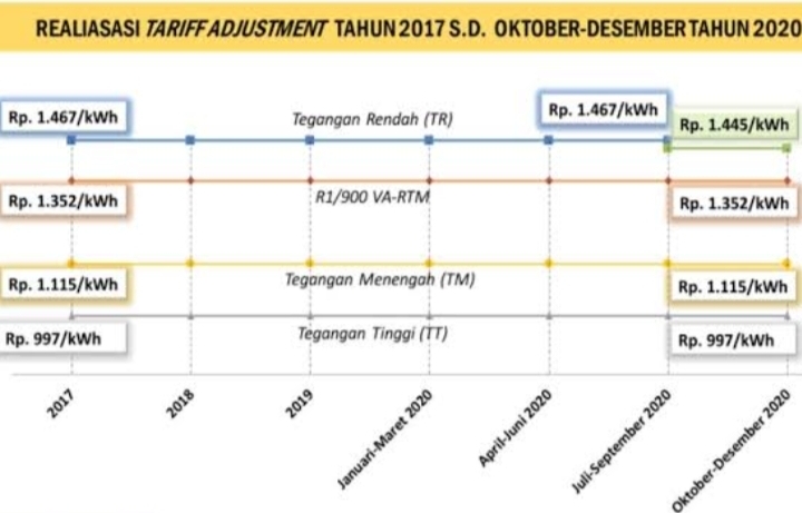 Golongan bisnis kecil dengan daya 6.600 VA hingga 200 kVA ditetapkan Rp 1.440,70 per kWh. Sedangkan untuk golongan menengah di atas 200 kVA, tarif berlaku Rp 1.114,74 per kWh.