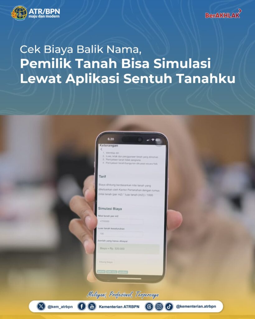“Masyarakat bisa cek alur balik nama dari Sentuh Tanahku. Mulai dari syarat dokumen yang perlu disiapkan hingga tarif layanan peralihan hak. Biaya untuk balik nama di BPN ditentukan dari nilai tanah dan luas tanahnya. Dalam Sentuh Tanahku ada fitur Simulasi Biaya yang bisa digunakan pemilik untuk mengetahui perkiraan biaya transaksi yang akan dilakukan,” jelas Kepala Biro Hubungan Masyarakat (Humas) dan Protokol, Harison Mocodompis, dalam keterangannya, di Jakarta, Jumat (12/09/2025).