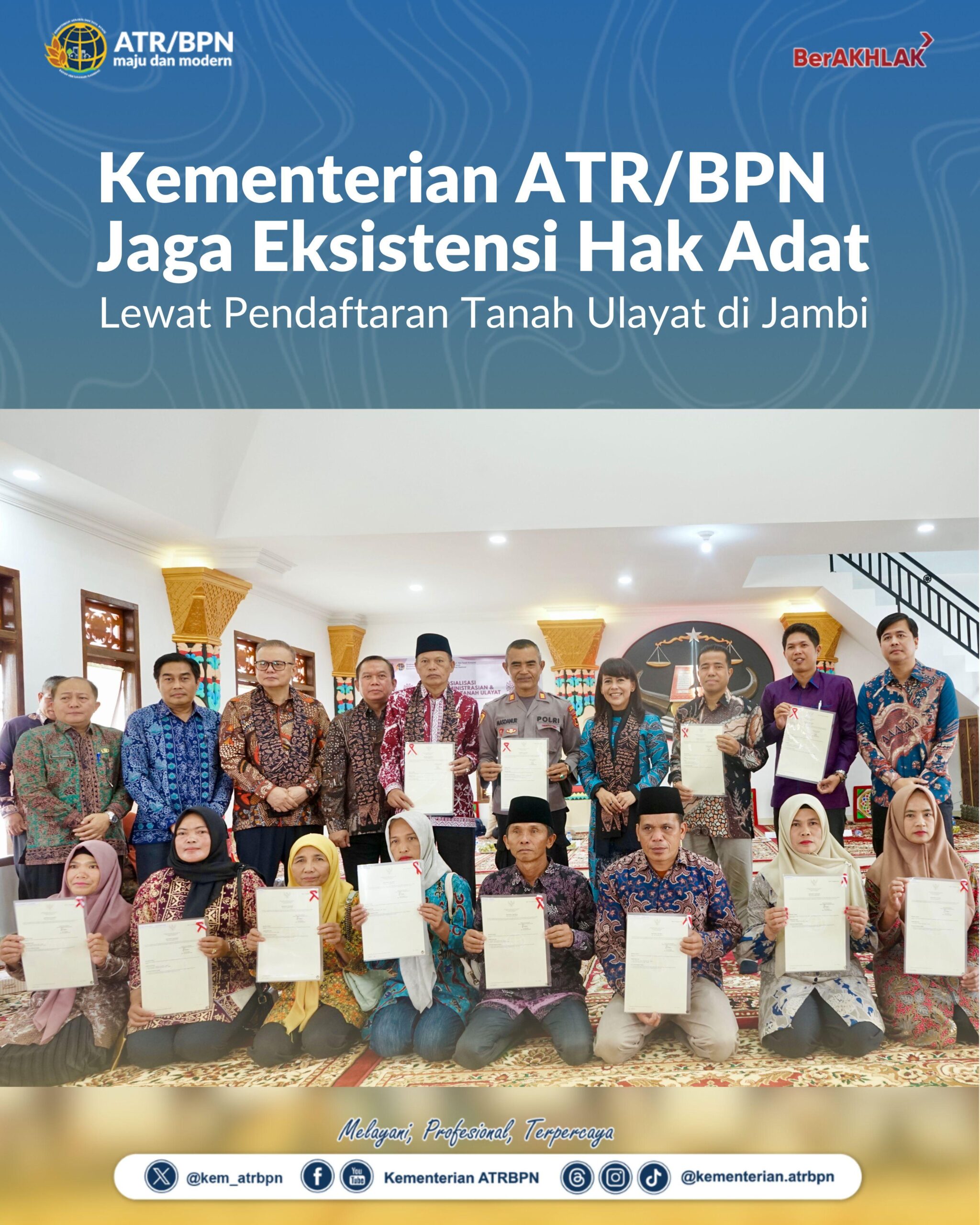 Sejalan dengan itu, Kepala Kantor Wilayah BPN Provinsi Jambi, Humaidi, berharap kolaborasi terus berjalan bukan hanya sebatas program, namun jadi gerakan bersama untuk melindungi hak-hak adat secara berkesinambungan. “Kami mengimbau seluruh pemangku kepentingan, mulai dari pemerintah daerah, tokoh adat, niniak mamak, hingga masyarakat luas, untuk bergotong royong mendorong proses pendaftaran tanah ulayat. Dengan niat yang baik, kita dapat memastikan tanah ulayat tetap lestari dan memiliki manfaat nyata bagi generasi mendatang,” pungkasnya.