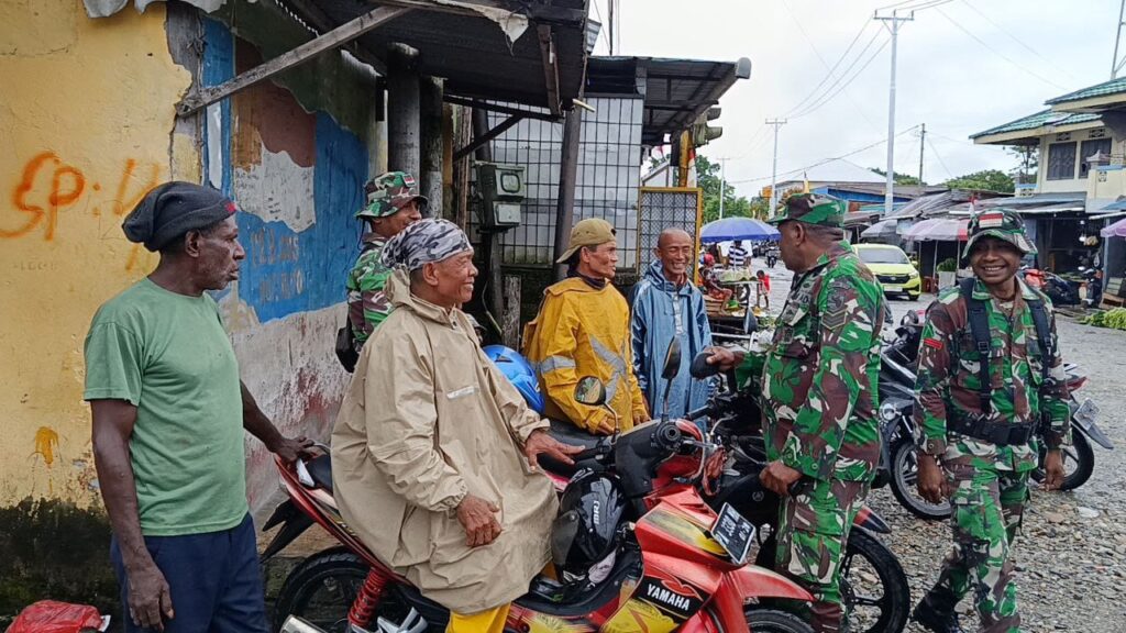Timika , – EKOIN – CO – Bersama komponen pendukung dari GM FKPPI, Banser, Pemuda Gereja, Kerukunan KKSS dan Personel Komcad, Kodim 1710/Mimika melaksanakan patroli kembali menggelar patroli cipta kondisi secara humanis di wilayah sembari berkomunikasi sosial untuk menyampaikan pesan Kamtibmas, Senin (15/09/2025). Pada kegiatan patroli kali ini, para Babinsa dan Komduk melaksanakan tatap muka dengan warga masyarakat yang sedang beraktifitas untuk memberikan pesan-pesan dan himbauan Kamtibmas.