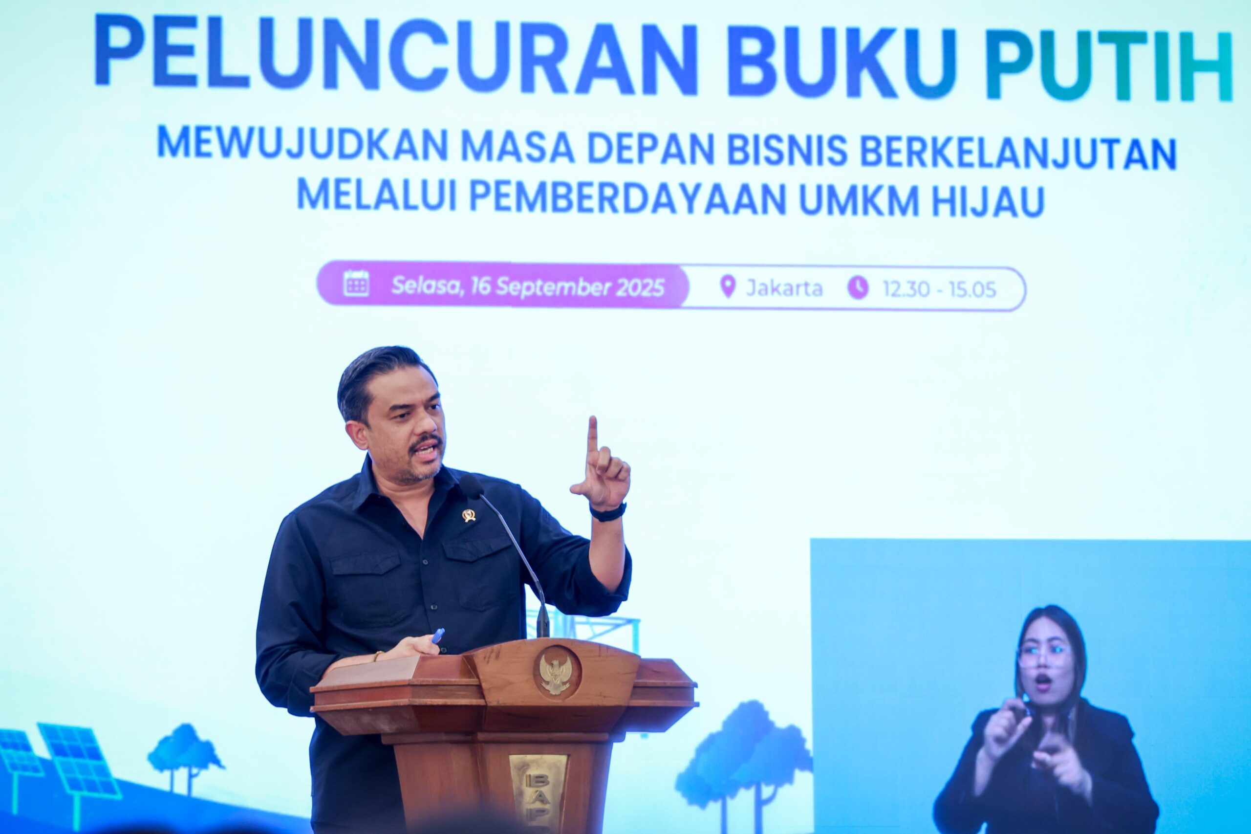 “UMKM hijau adalah UMKM yang mampu mengadopsi praktik ramah lingkungan. Dengan terbitnya buku putih ini, kami berkeyakinan bahwa peran UMKM sebagai agen utama pertumbuhan yang hijau dan iklusif dan kesiapan transisi UMKM menuju UMKM Hijau akan semakin cerah,” ujar Menteri Maman saat memberikan sambutan dalam acara Peluncuran Buku Putih “Mewujudukan Masa Depan Bisnis Berkelanjutan Melalui Pemberdayaan UMKM Hijau” di Jakarta, Selasa (16/9).