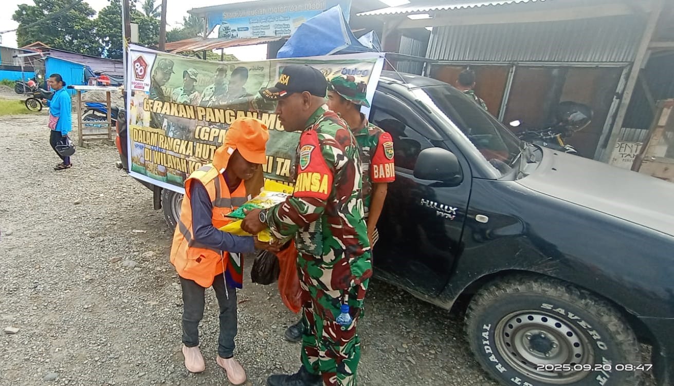 Timika -,- EKOIN – CO – Dalam rangka menstabilkan harga beras di pasaran, Kodim 1710/Mimika melalui Koramil jajaran berkolaborasi dengan Bulog terus menggelar Gerakan Pangan Murah untuk warga Timika, kegiatan berlokasi di tiga titik yaitu di Car Free Day Jl. Cenderawasih, Depan Koramil 1710-02/Timika dan di Bundaran Sp. 2 Distrik Mimika Baru, Kab. Mimika, Sabtu (20/09/2025).