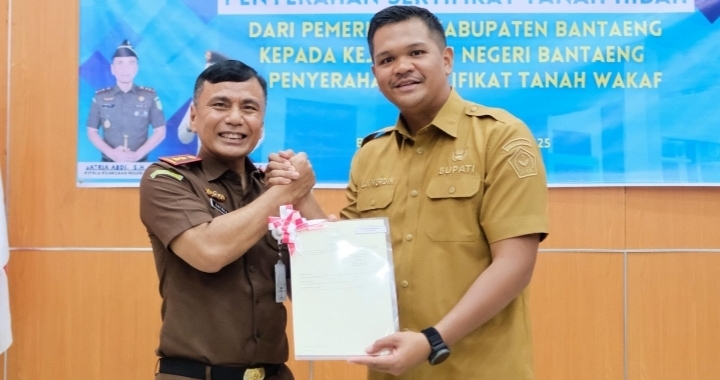 Bantaeng,EKOIN.CO- Pemerintah Kabupaten Bantaeng resmi menyerahkan sertifikat tanah hibah kepada Kejaksaan Negeri (Kejari) Bantaeng untuk pembangunan kantor baru pada Selasa (10/9/2025). Langkah ini disebut menjadi bentuk sinergi nyata antara pemerintah daerah dan lembaga penegak hukum dalam memperkuat layanan hukum kepada masyarakat.