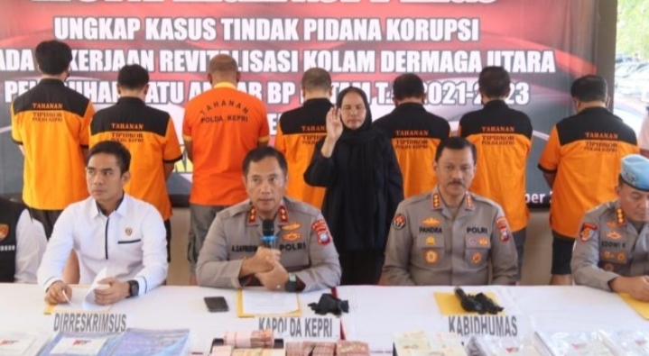 Dalam konferensi pers di pendopo Mapolda Kepri, polisi memamerkan barang bukti berupa uang tunai ratusan juta rupiah, pecahan dolar, hingga emas batangan mini. Para tersangka digiring dengan tangan diborgol, mengenakan rompi tahanan Tipikor, dan mencoba menghindari sorotan kamera awak media.