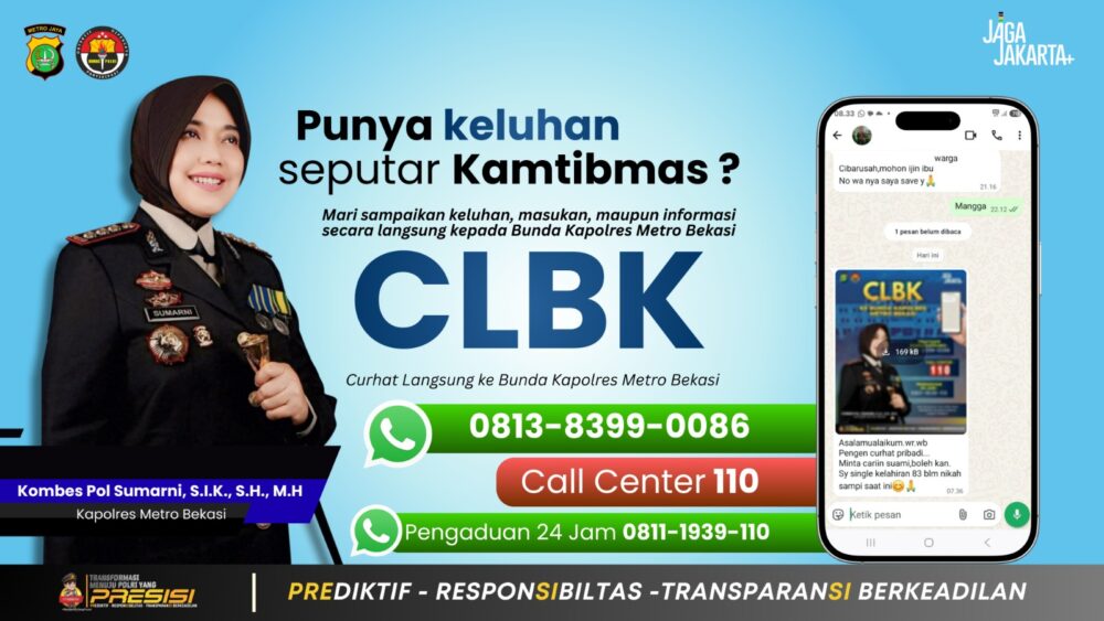 Selain CLBK, Polres Metro Bekasi juga membuka akses layanan pengaduan lain bagi masyarakat melalui Call Center Polri 110 serta nomor pengaduan 24 jam di 0811-1939-110.