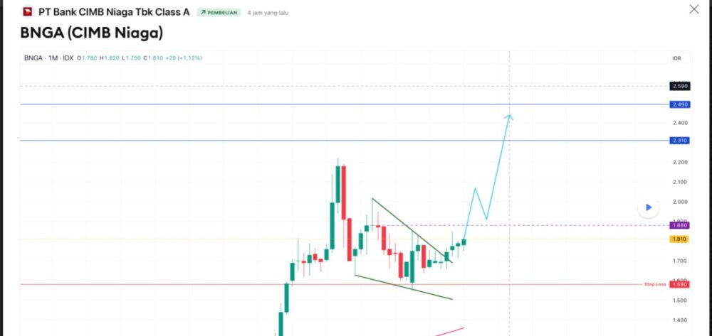 Analis memprediksi, jika BNGA sukses menjebol level Rp1.835 dengan volume transaksi yang signifikan, harga berpotensi melesat menuju kisaran Rp1.950 hingga Rp2.000 dalam waktu dekat.