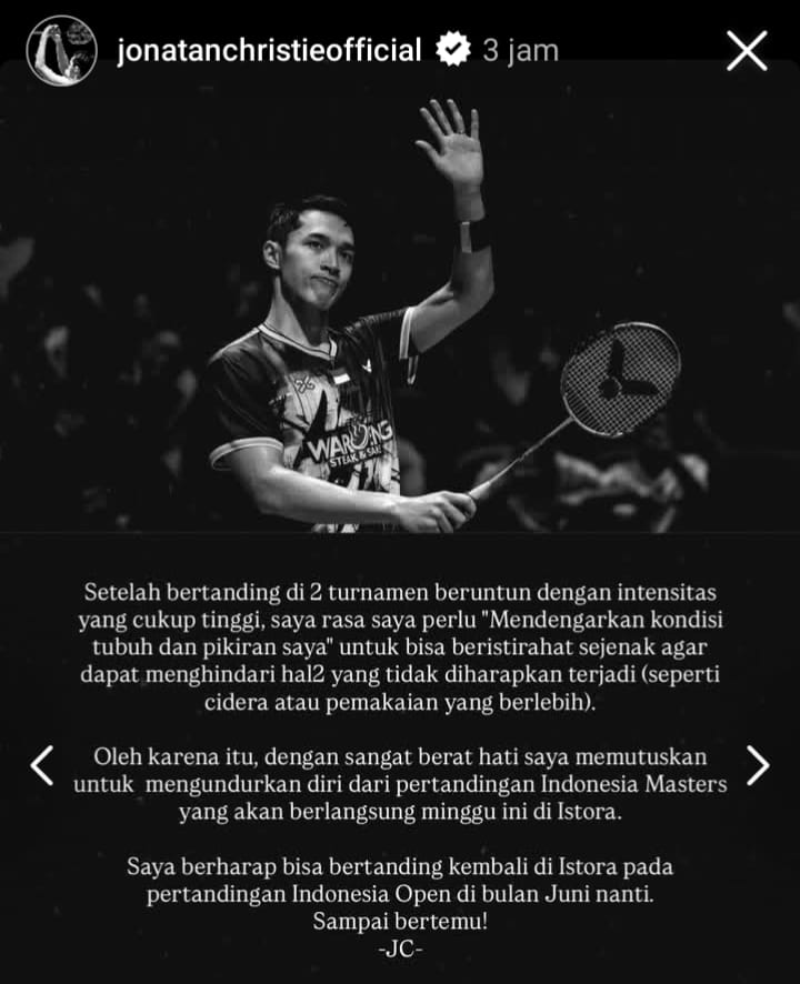 Tags: Indonesia MasterJaga KebugaranJonathan ChristieMemutuskan Mundur