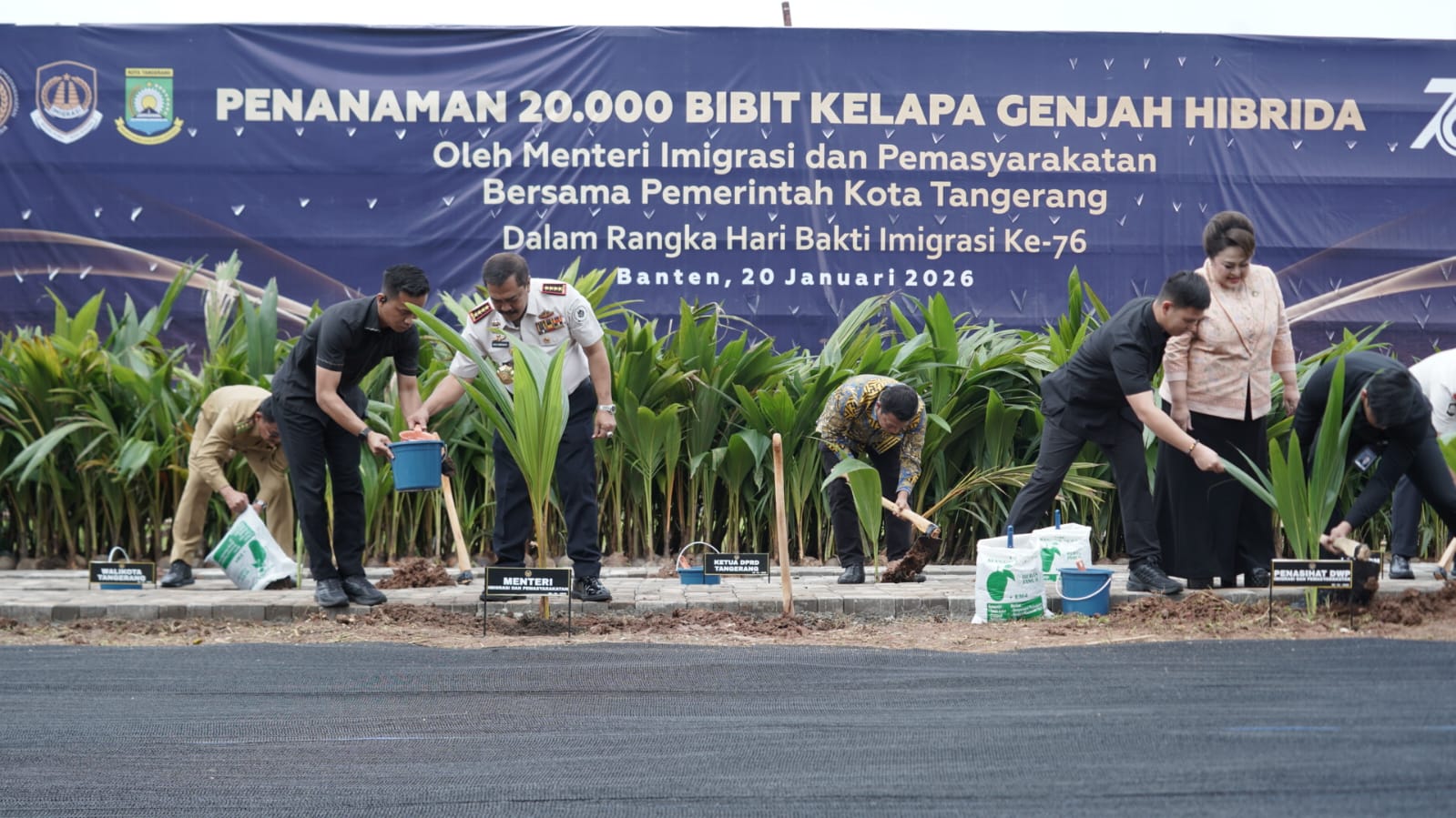 Menteri Imigrasi dan Pemasyarakatan (Kemenimipas), Agus Andrianto, secara simbolis menanam bibit kelapa genjah hibrida dalam peringatan Hari Bakti Imigrasi ke-76 di Tangerang, Banten, Selasa (20/1/2026). (Foto: Dok. Kemenimipas).