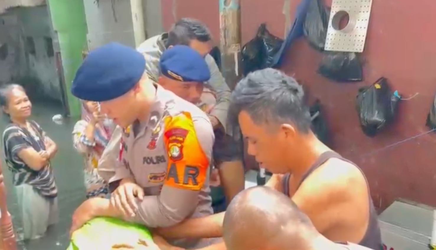 Di tengah keterbatasan akses akibat tingginya genangan air, personel kepolisian memastikan keselamatan warga yang membutuhkan penanganan medis segera.