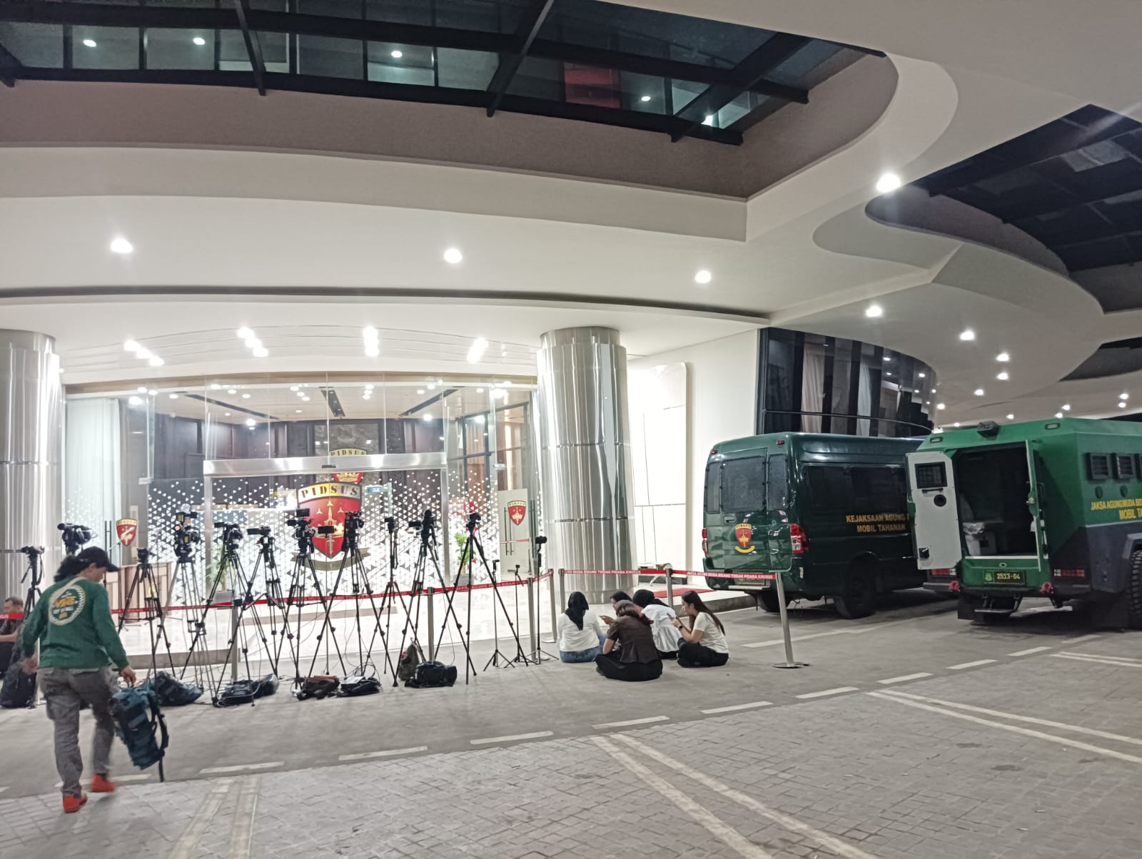 Pantauan ekoin langsung pada jam 20:00 terlihat awak media menunggu konferensi pers 11 tersangka kasus korupsi yang telah di tetapkan kejagung (10/02/2026). ()